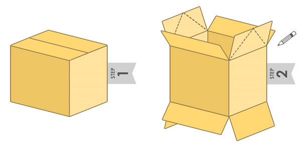 Этот вариант требует немного больше внимания и точности. Мы не только соединим картонный клапан коробки, но и буквально сделаем седловидную крышу для подставки. Подготовьте вместительную картонную коробку. Канцелярским ножом обрежьте клапаны коробки с одной стороны, а с другой стороны их нужно разрезать по рисунку: